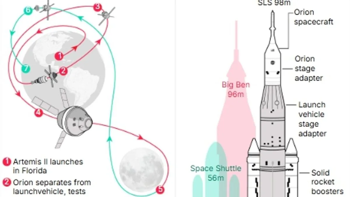 La fusée SLS est constituée de plusieurs éléments, notamment d'un système de lancement et de la capsule Orion, qui se trouve au sommet. Au moment du décollage, quatre moteurs RS-25 fonctionneront en continu pendant 8,5 minutes. Combinés aux deux propulseurs, ils généreront une poussée de 8,8 millions de livres-force, ce qui est plus que n'importe quelle fusée de l'histoire. Après le lancement, la capsule Orion, transportant l'équipage, se séparera du deuxième étage de la fusée et entrera dans une orbite très elliptique autour de la Terre. L'équipage passera ensuite les premiers jours à effectuer des vérifications approfondies des systèmes. Ces vérifications incluent les systèmes de survie, de propulsion, de navigation et de communication de la capsule, afin de s'assurer qu'elle est prête à se diriger vers l'espace lointain.