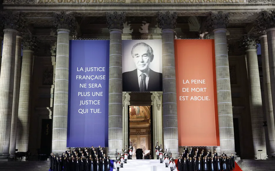 Robert Badinter a été introduit au Panthéon au crépuscule du 9 octobre, alors que la lumière du jour s'estompe et que la façade du bâtiment s'illumine, révélant l'inscription « Aux grands Hommes, la patrie reconnaissante ».