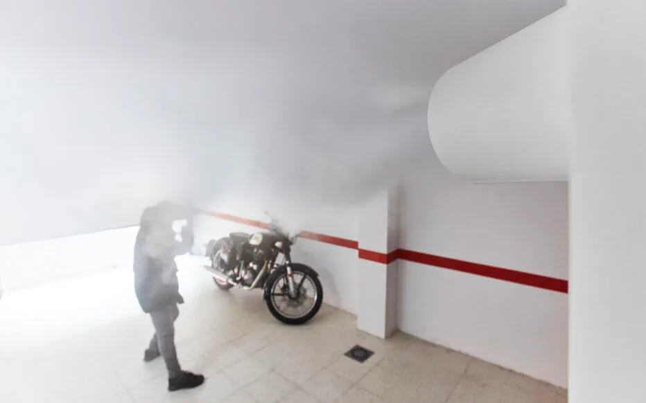 En seulement 30 secondes, un nuage de fumée blanche sèche rend la pièce opaque.
